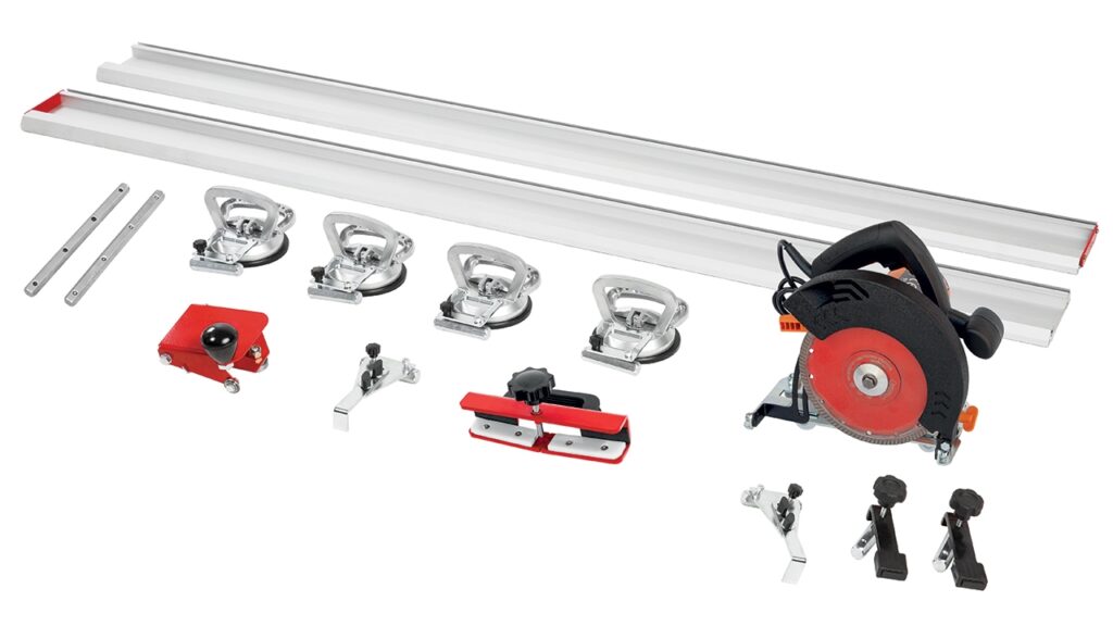 Конструкція складається з двох напрямних 1650 мм, каретки з ріжучим елементом, двигуна з алмазним диском, деталей кріплення для різання кераміки з нерівною поверхнею, щипців для точного розлому, сполучних елементів і чотирьох вакуумних присосок.